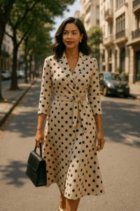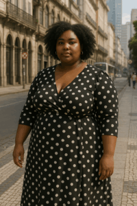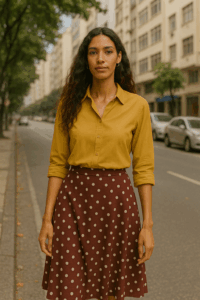 Já mulheres com silhueta reta ou triangular invertida podem usar o poá na parte de baixo como elemento de construção de volume visual. Saias com poás maiores, tecidos mais encorpados e pregas sutis criam presença, movimento e proporcionalidade.